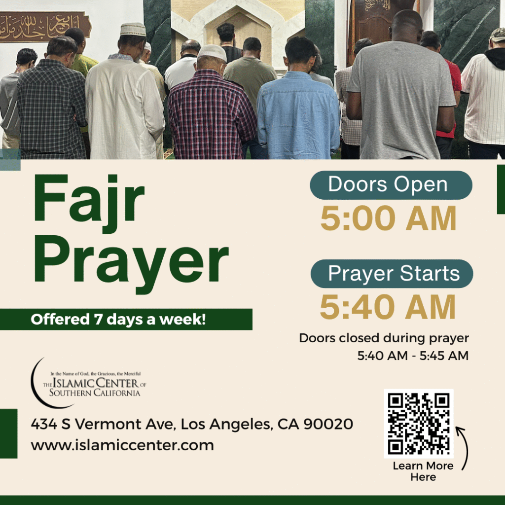 Please note that beginning Sunday, November 26, 2025 Fajr prayer time will be at 5:40 AM.